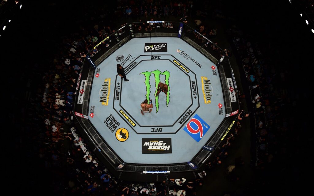 Under TKO Group Holdings, both properties have leaned heavily into visible sponsorships. The UFC’s Octagon has become a fully branded environment, with logos on the canvas, the cage, and broadcast graphics. Sponsorship revenue now represents a significant portion of the promotion’s overall business, driven largely by how often those brands appear on screen.